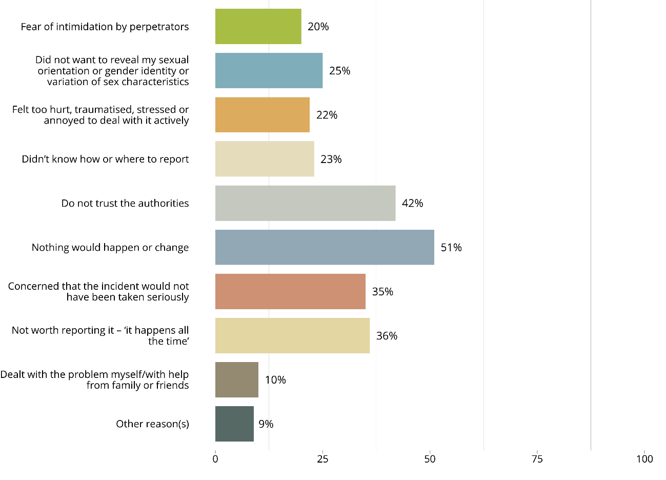 Figure 12 highlights that the main reasons behind under-reporting discrimination are a lack of confidence that anything would change (51 %), distrust in the authorities (42 %), a belief that the incident is not worth reporting (36 %) or that it will not be taken seriously (35 %).