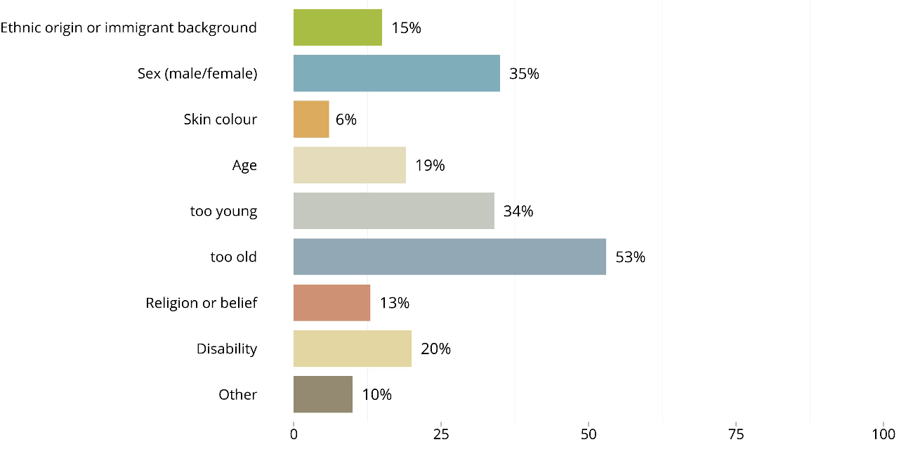 The survey asks respondents whether, in the previous year, they had felt discriminated against because of being LGBTIQ or any other reason, in employment, housing, healthcare, education, social life or in contact with authorities. Discrimination was defined as the situation in which someone is treated less favourably than another because of ethnic origin, gender, gender identity, gender expression, sexual orientation, sex characteristics, race or skin colour, immigrant background or nationality, religion or belief, age, disability or for any other reason.