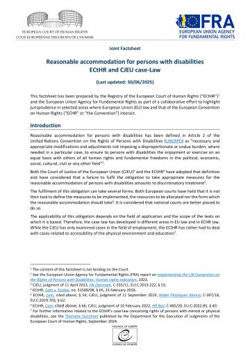 This factsheet summarises key Court of Justice of the European Union (CJEU) and European Court of Human Rights (ECtHR) cases on reasonable accommodation for persons with disabilities. Building on Article 2 of the United Nations Convention on the Rights of Persons with Disabilities (UNCRPD), the courts address employment, physical accessibility, and education. In collaboration, the EU Agency for Fundamental Rights and the European Court of Human Rights produced this short publication. It is designed to aid lawyers and policymakers in understanding and applying the jurisprudence in this area.